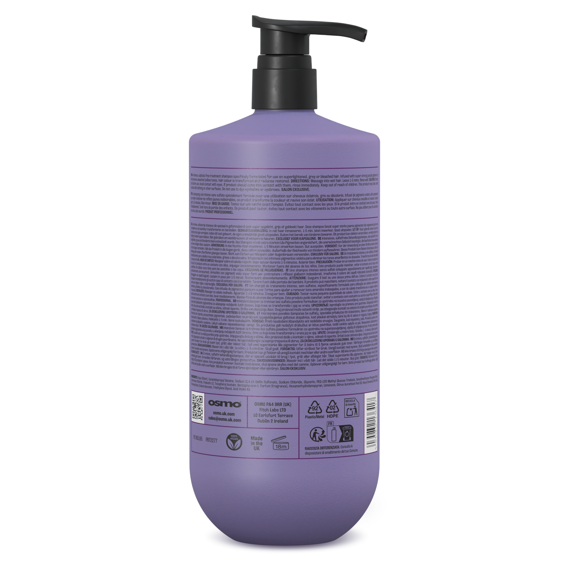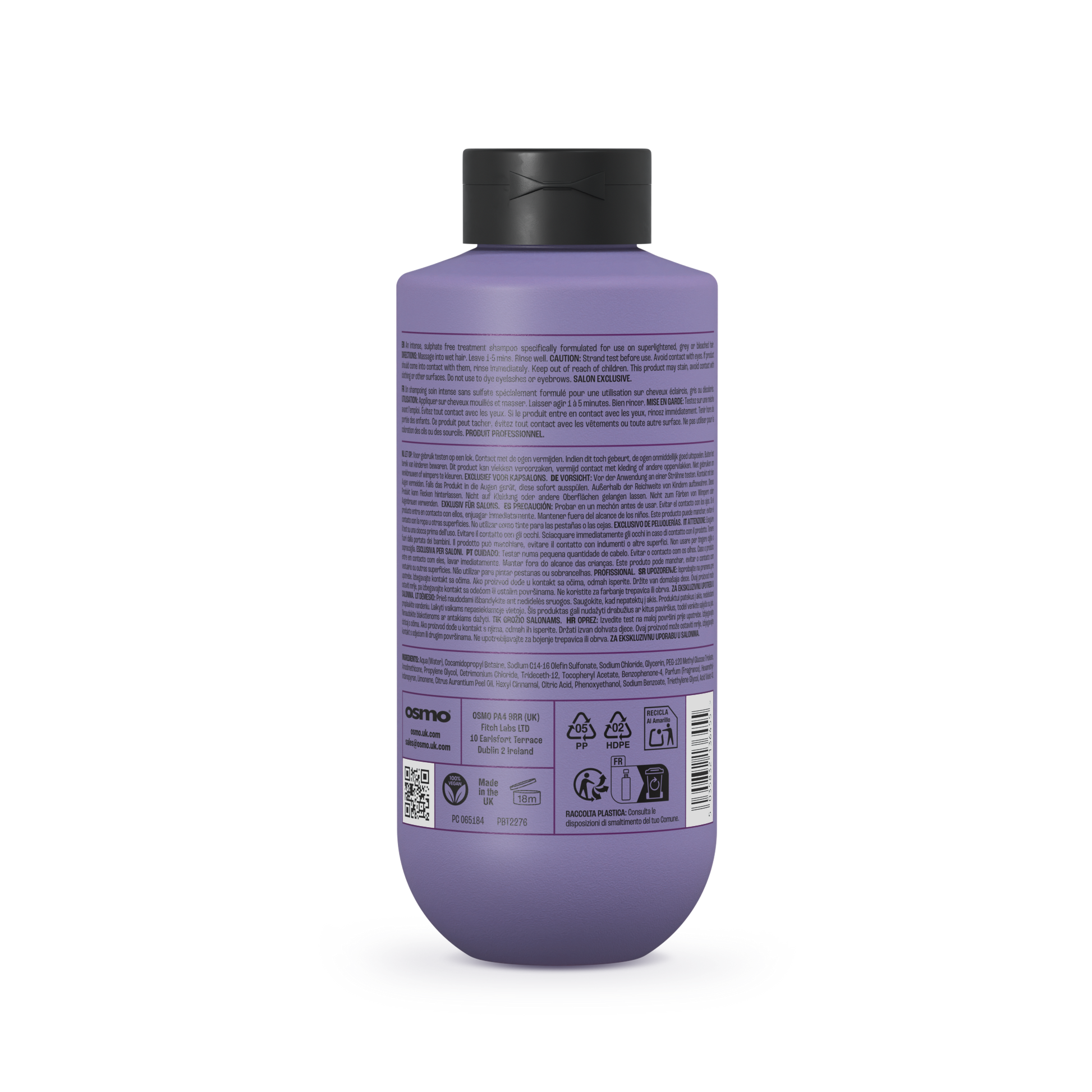 An intense, sulphate free treatment shampoo specifically formulated for use on super lightened, grey or bleached hair. Infused with super strong purple pigments to help remove unwanted yellow tones, hair colour is transformed and radiance restored.